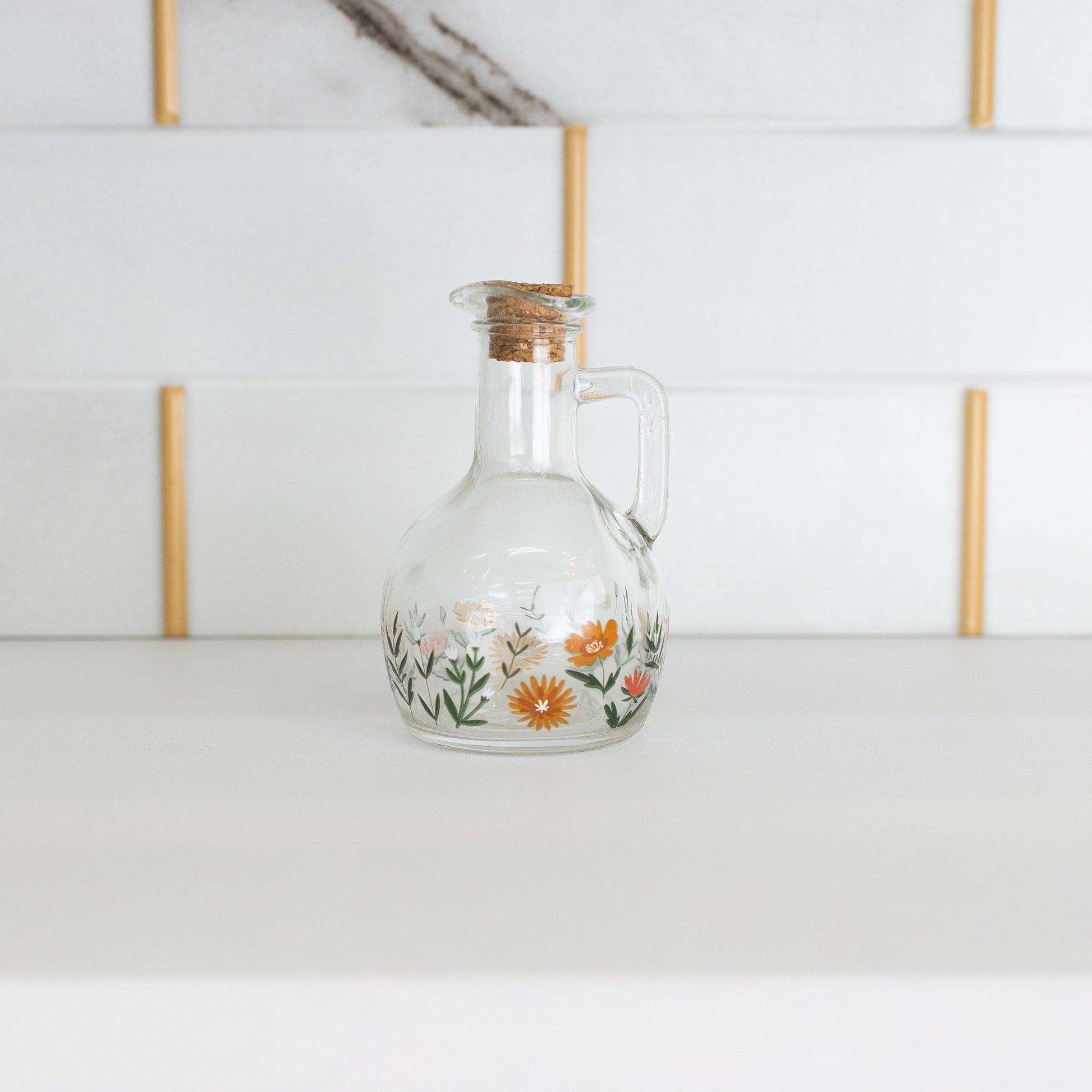 Leve praticidade e charme para sua mesa com a garrafa de vidro Flora , ideal para armazenar e servir azeite com estilo.